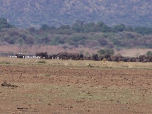 Our drive turned around and said, “Hold on!” Sandi and I were sitting on the raised back seats in this 6 person vehicle, not counting the driver and guide up front. What happened next was a dash across bumpy, rocky, curving tire-trail toward the river. I had not put on my seat belt so I could position for good photo shots. Nor had Sandi. Kito, our driver, made a dash for the river. It is a miracle we were not tossed backwards or sideways from the vehicle. I’ve never ridden a bucking bronco or bull but have an idea what it would be like. Thousands of wildebeast and zebras began streaming across the river.