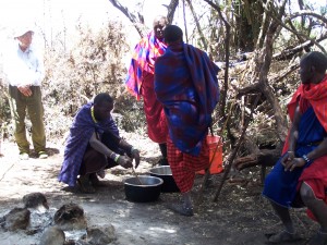 The chief says they fear losing their polygamistic culture and asked us what we thought. One in our group, Thom, said “I’ve never tried it,” which evoked laughter from the chief. Someone asked him about God, what he thought about religion. He said, “That’s a good question. Among the Massai are Christians and Muslims. We believe in God. There is one God for everybody in the world. Massai believe we call God “She” or “Big Mama and we have more respect for women. We have a second god, women. There is no life without women. The color of the female God is blue, for the heavens. At this point, we followed him down a narrow trail to a clearing where there were two pots over a smoldering fire not far from them several pieces of meat on sticks stuck in the ground over another smoldering fire.