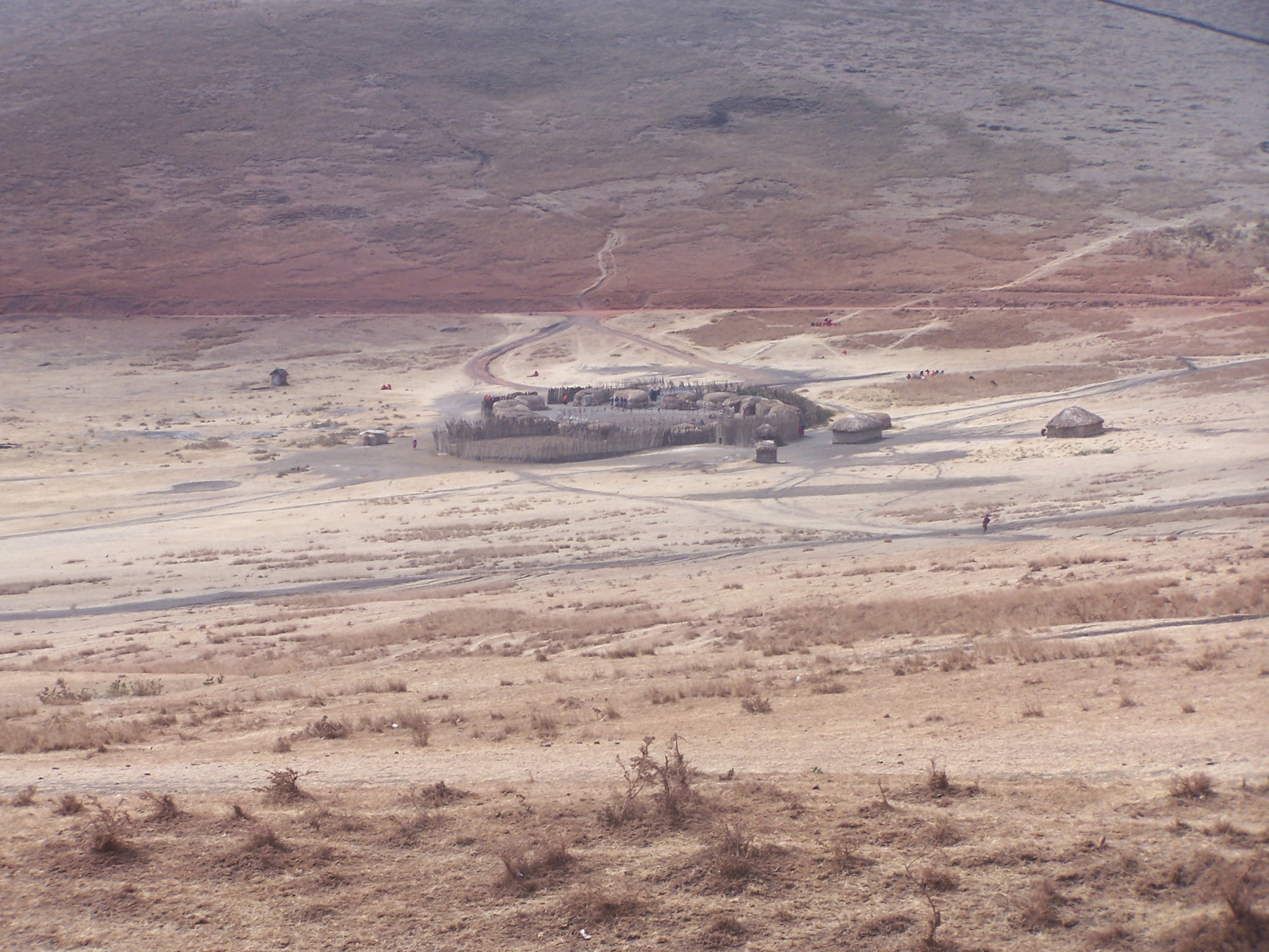 We descended switchbacking into the Ngoragora Crater on a dirt road and saw several bomas or compounds on the way.