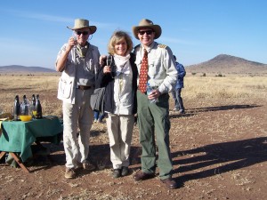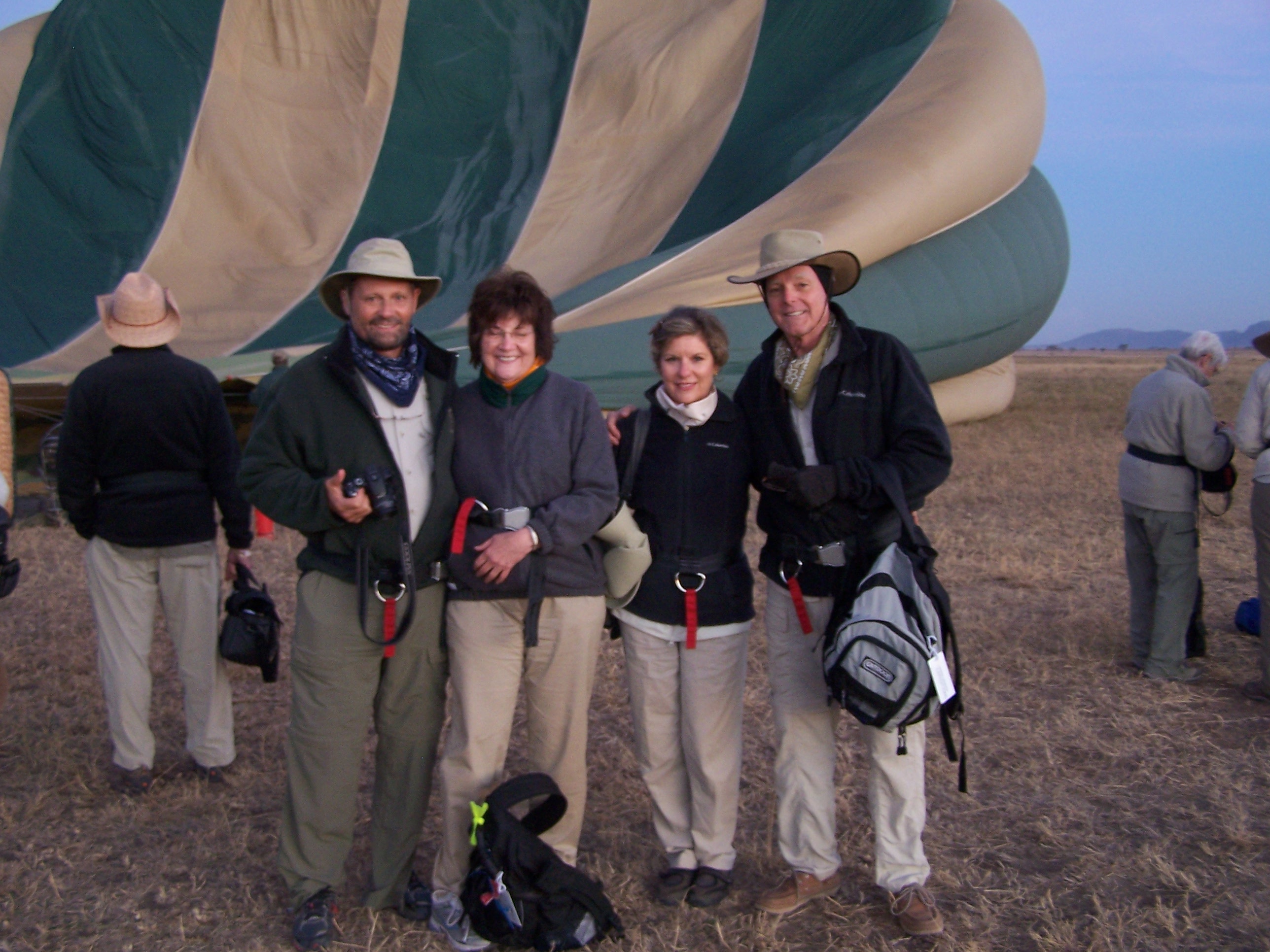 The ride lasted about an hour. We bumped three of four times on the ground and the deflating balloon pulled us to a stop. This time we climbed out upright. Some of our African guides had set up a table with champagne. Nick gave the history of why we were drinking champagne, that the first balloon flight (flown by Frenchmen) ended with a champagne celebration.
