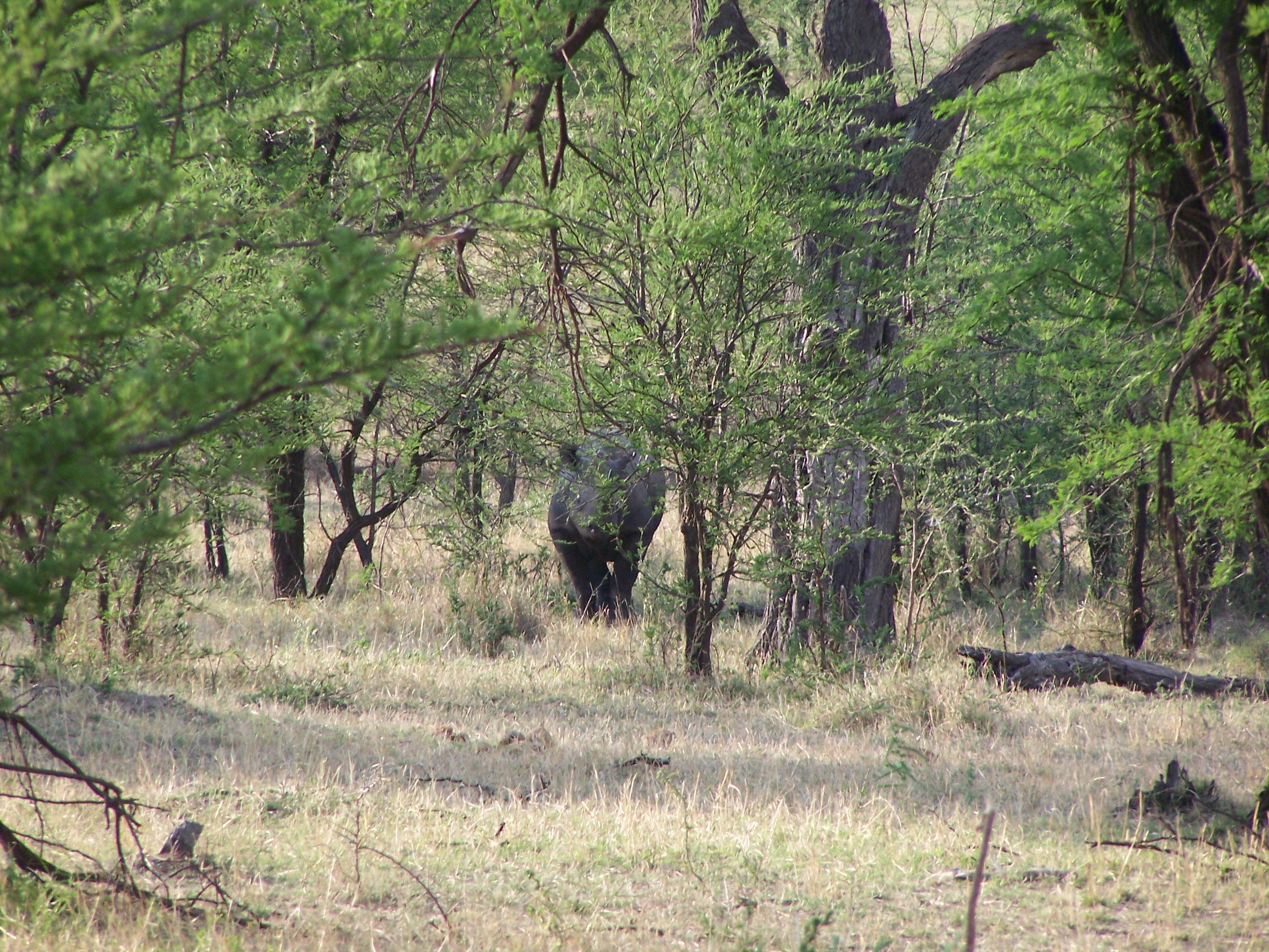 After breakfast, we had free time until lunch and after lunch launched another safari. Arnold went to a different place. He said rhino were known to be there. He had the eyes of an eagle. Soon, he stopped and pointed. “Rhino!” Not one, but two, a mother and her calf.